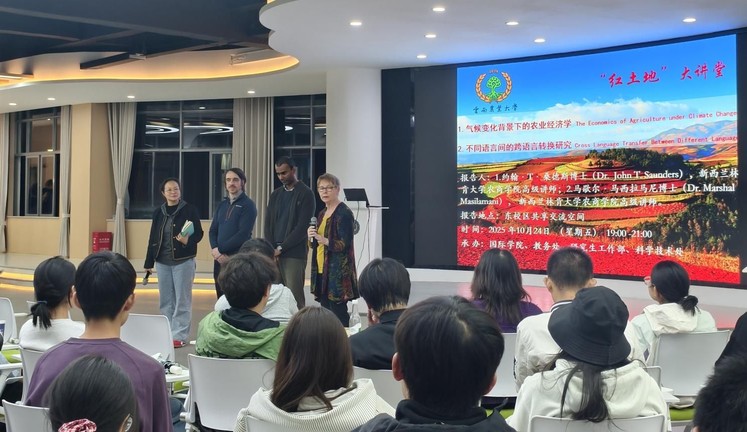 本站消息 10月24日,新西兰林肯大学农商学院高级讲师约翰・T・桑德斯博士、马歇尔・马西拉马尼博士应邀做客学校“红土地”大讲堂,国际学院副院长路遥主持,凯瑟琳・比克内尔博士及近四百名师生参加。