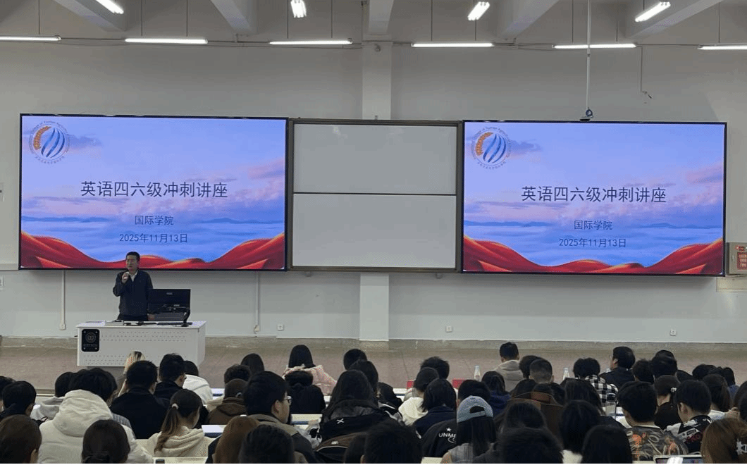 为充分调动同学们全国大学生英语四六级备考积极性,树立必胜信心,以昂扬姿态迎接考试。2025年11月13日中午,学院在明理楼阶梯教室举办英语四六级冲刺辅导讲座。学院党委副书记徐兴倩、各班主任辅导员及500余名学生参加讲座。
