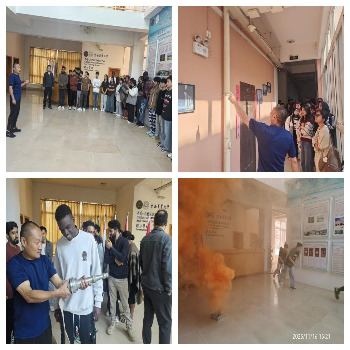 为落实学校“全民消防、生命至上一安全用火用电”为主题的消防宣传月系列活动,2025年11月16日下午,国际学院联合学校保卫处,为全体在校留学生及住在田家炳楼的外籍教师开展了消防培训演练。