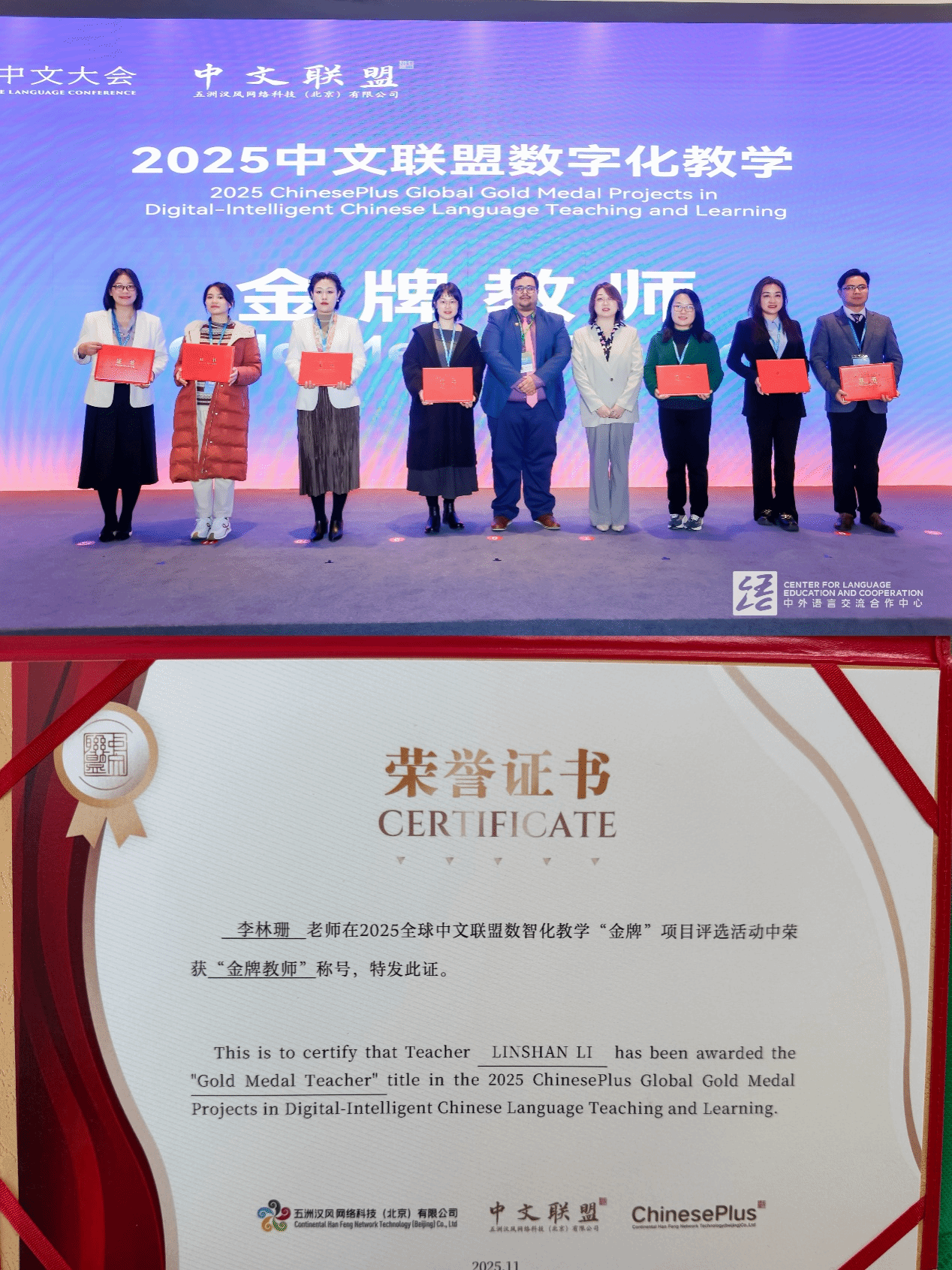 11月16日,在2025全球中文联盟伙伴大会的平行会场颁奖现场,我校国际学院汉语国际教育专业的李林珊老师获得2025全球中文联盟数智化教学“金牌教师”称号。
