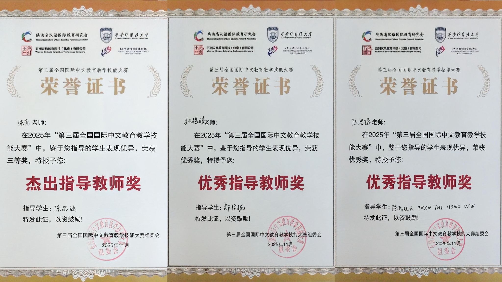 本站消息 近日,在第三届全国国际中文教育教学技能大赛中,学校国际学院4名学子经过初赛、复赛和决赛选拔,凭借扎实的教学功底与亮眼的临场表现斩获佳绩,实现了学校在该专业全国性教学竞赛奖项上零的突破。
